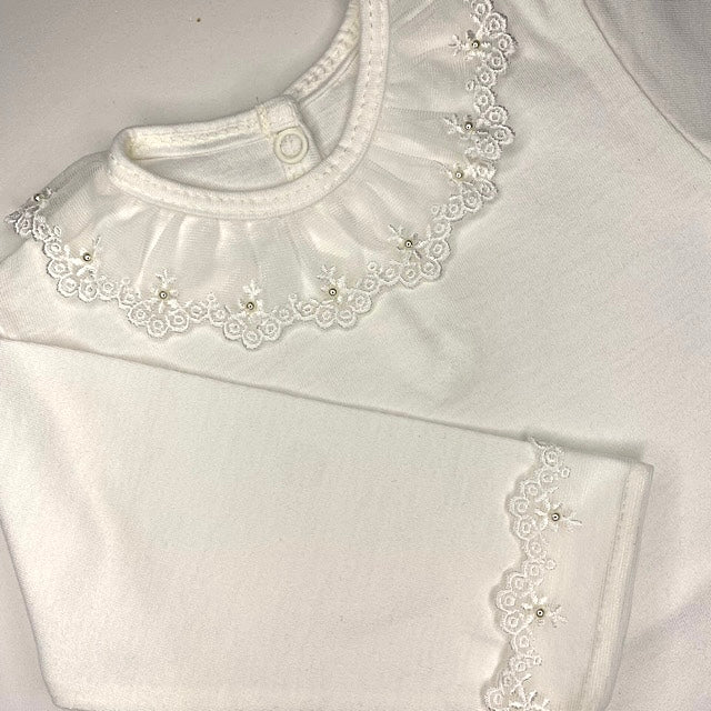 - Gola e punhos de renda cru bordada com aplicação de mini pérolas.