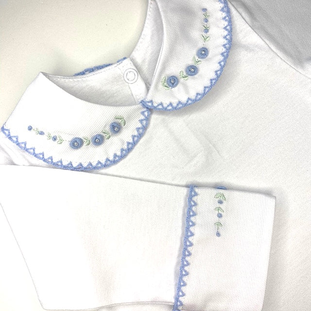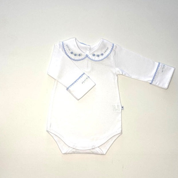 - Gola arredondada com bordado rococó, punhos com mesmo bordado da gola.
