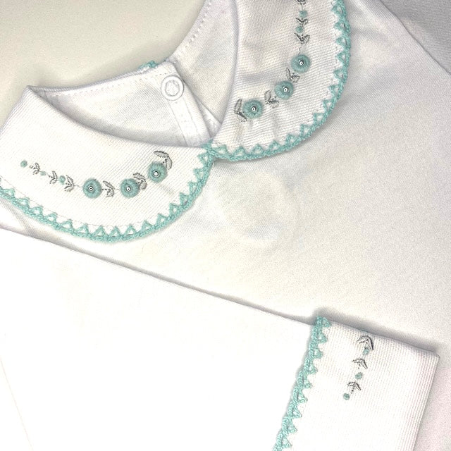 - Gola arredondada com bordado rococó, punhos com mesmo bordado da gola.